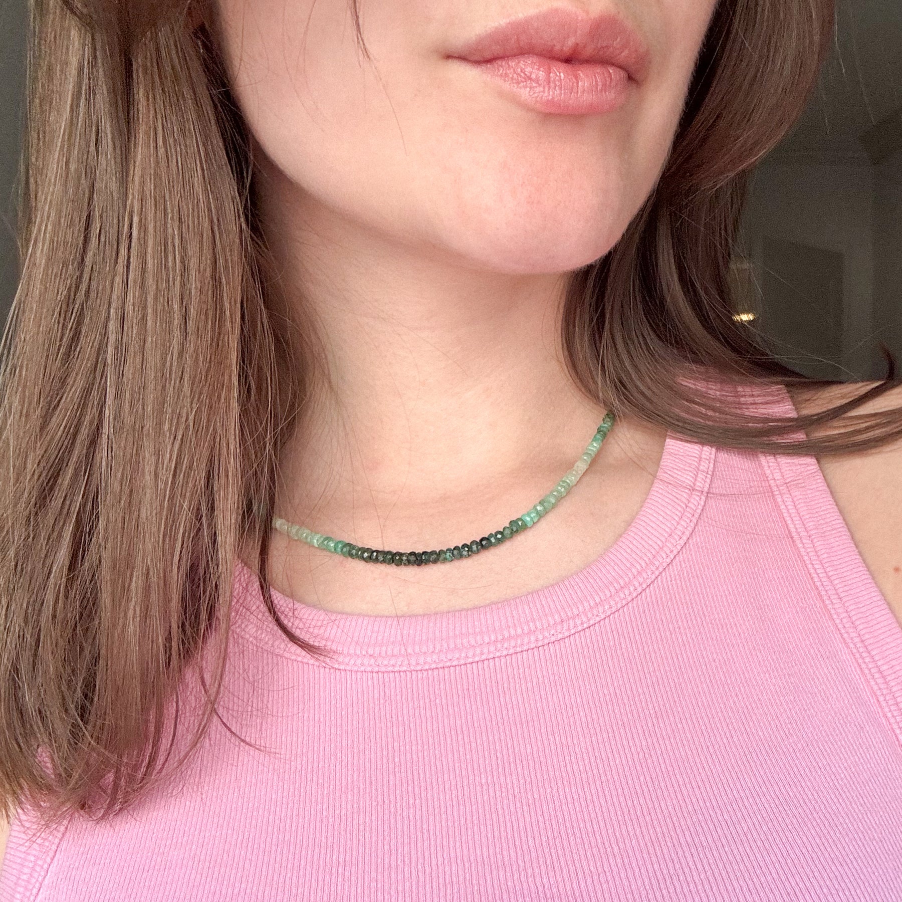 Handgefertigte Halskette aus hochwertigem Smaragd. Die Halskette ist ein Einzelstück und somit nur einmal erhältlich.