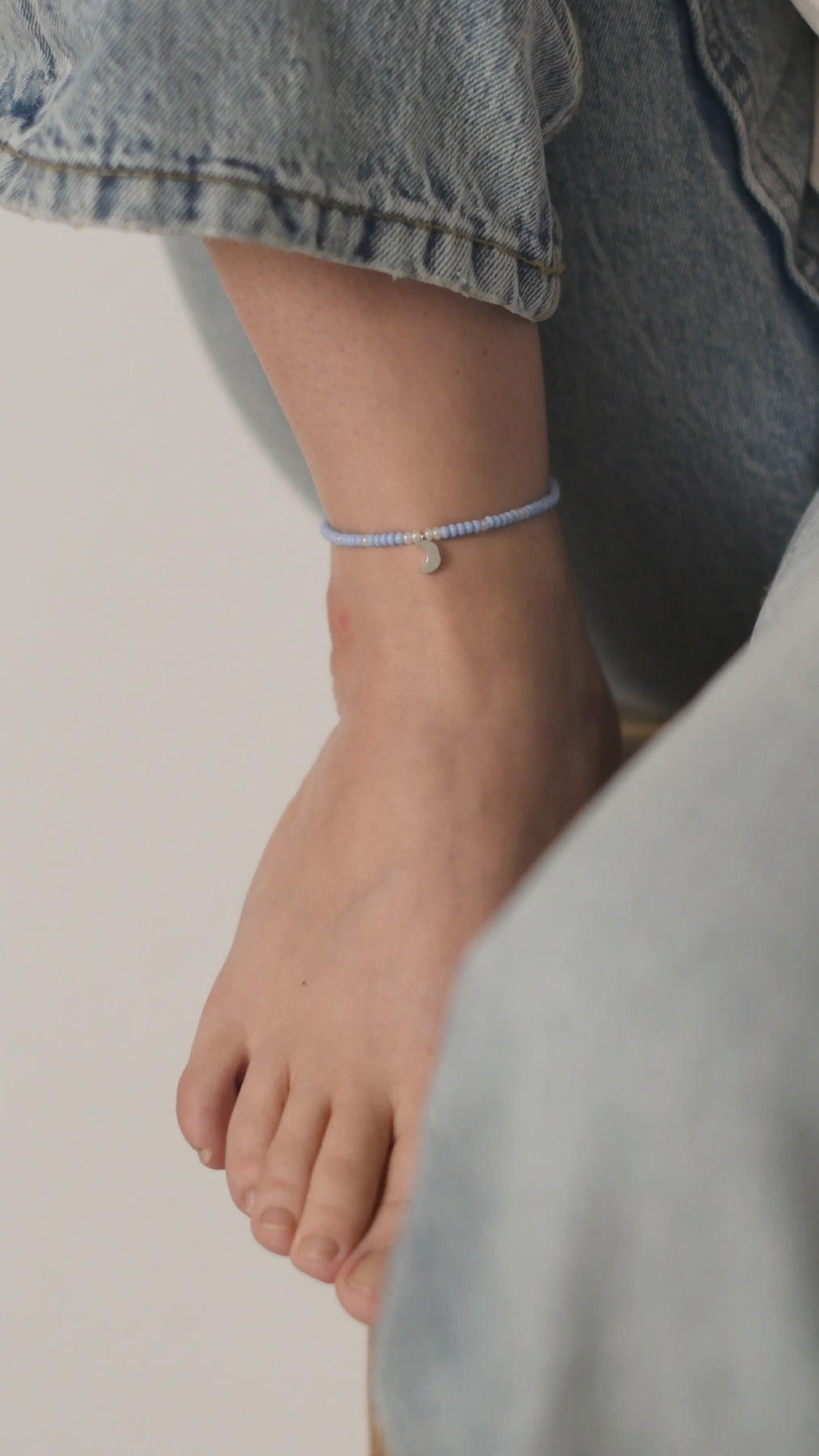 Fusskette Eternal Night – inspiriert vom Himmel der Dämmerung. Hellblaue Perlen und ein feiner Mondanhänger verleihen eine sanfte, träumerische Ausstrahlung. Ruhig, leuchtend und voller kleiner Magie.