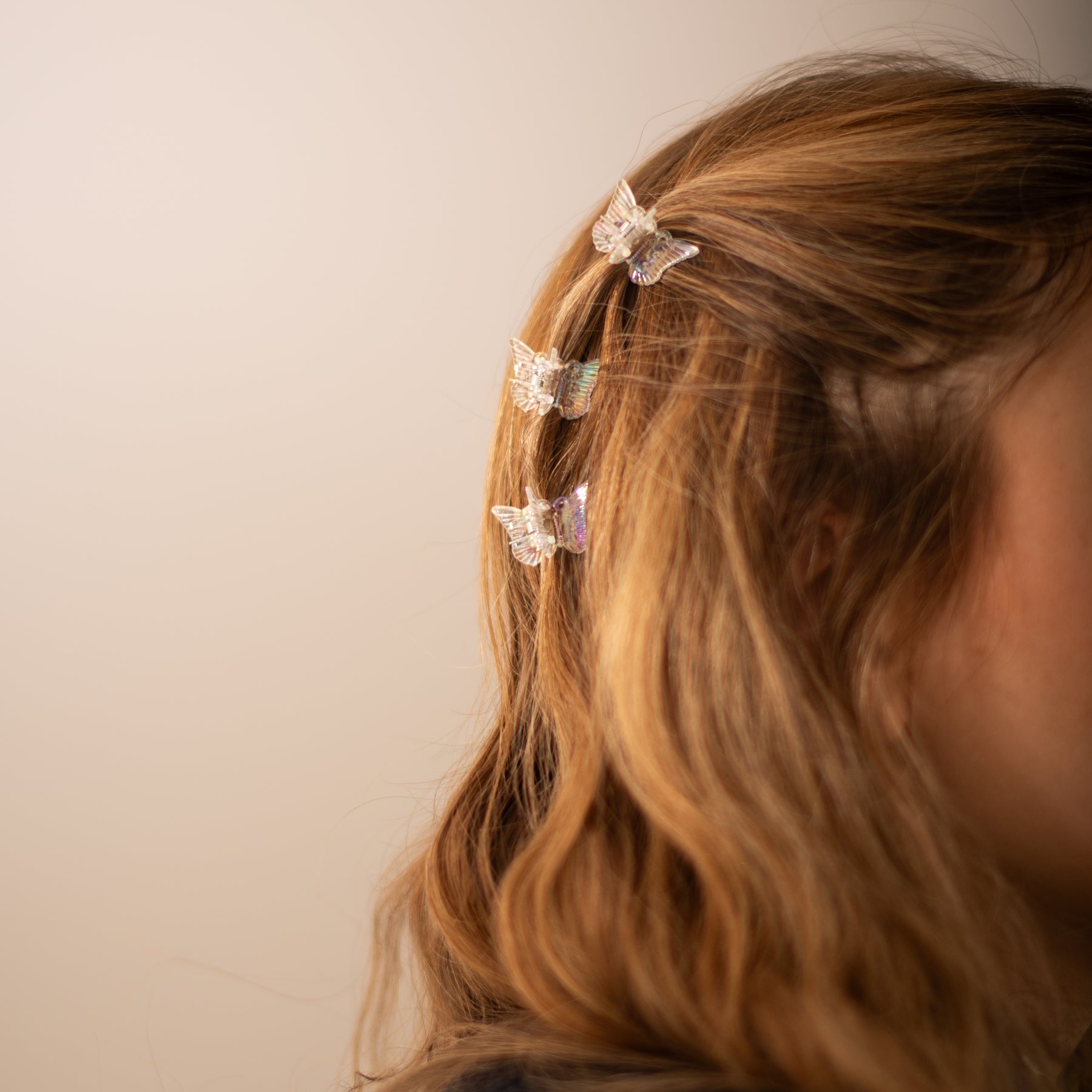 Die Haarklammer Butterfly Mini eignet sich perfekt für verspielte Frisuren. Die irisierende Farbe schimmert im Licht in verschiedensten Farben.