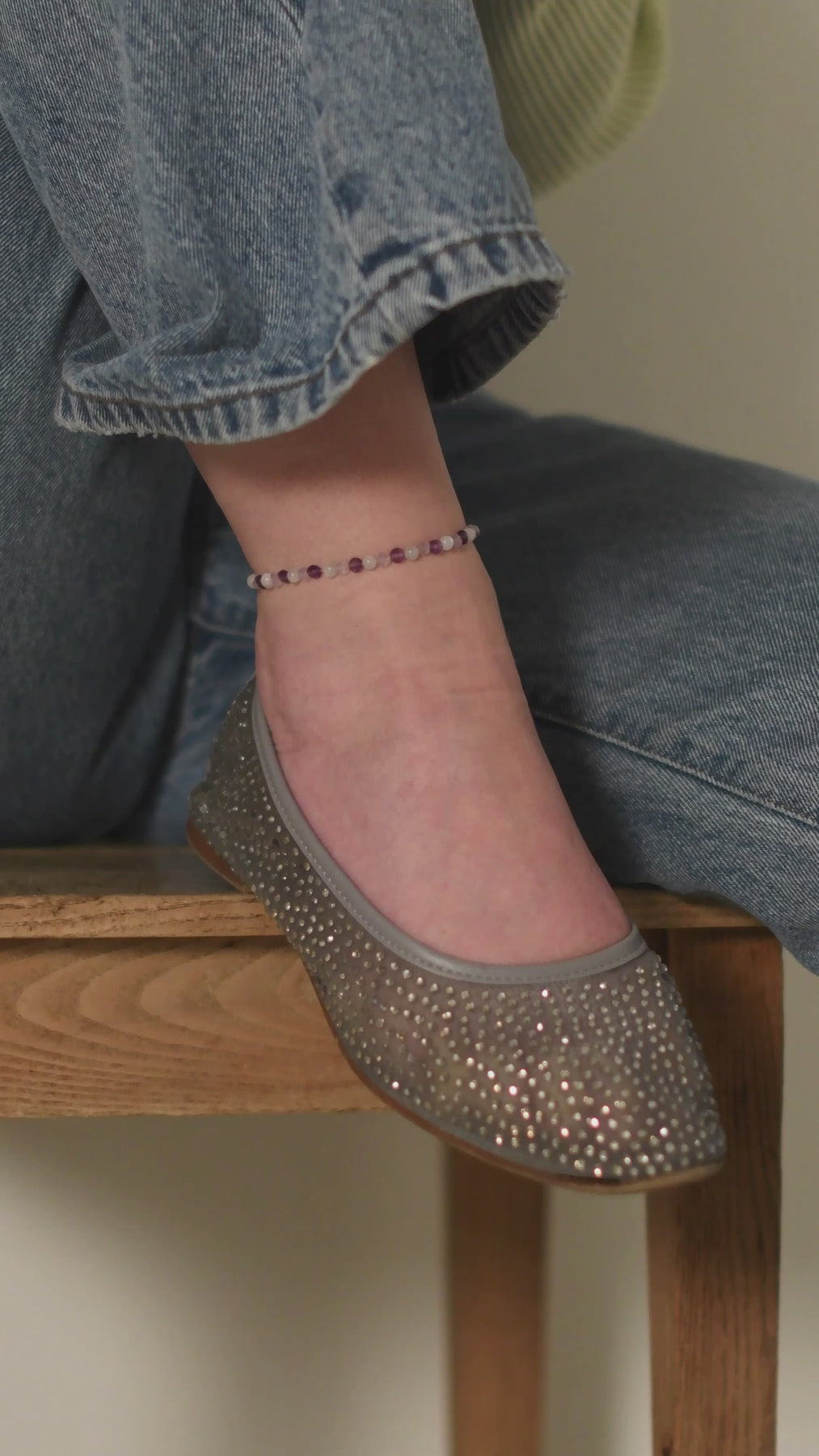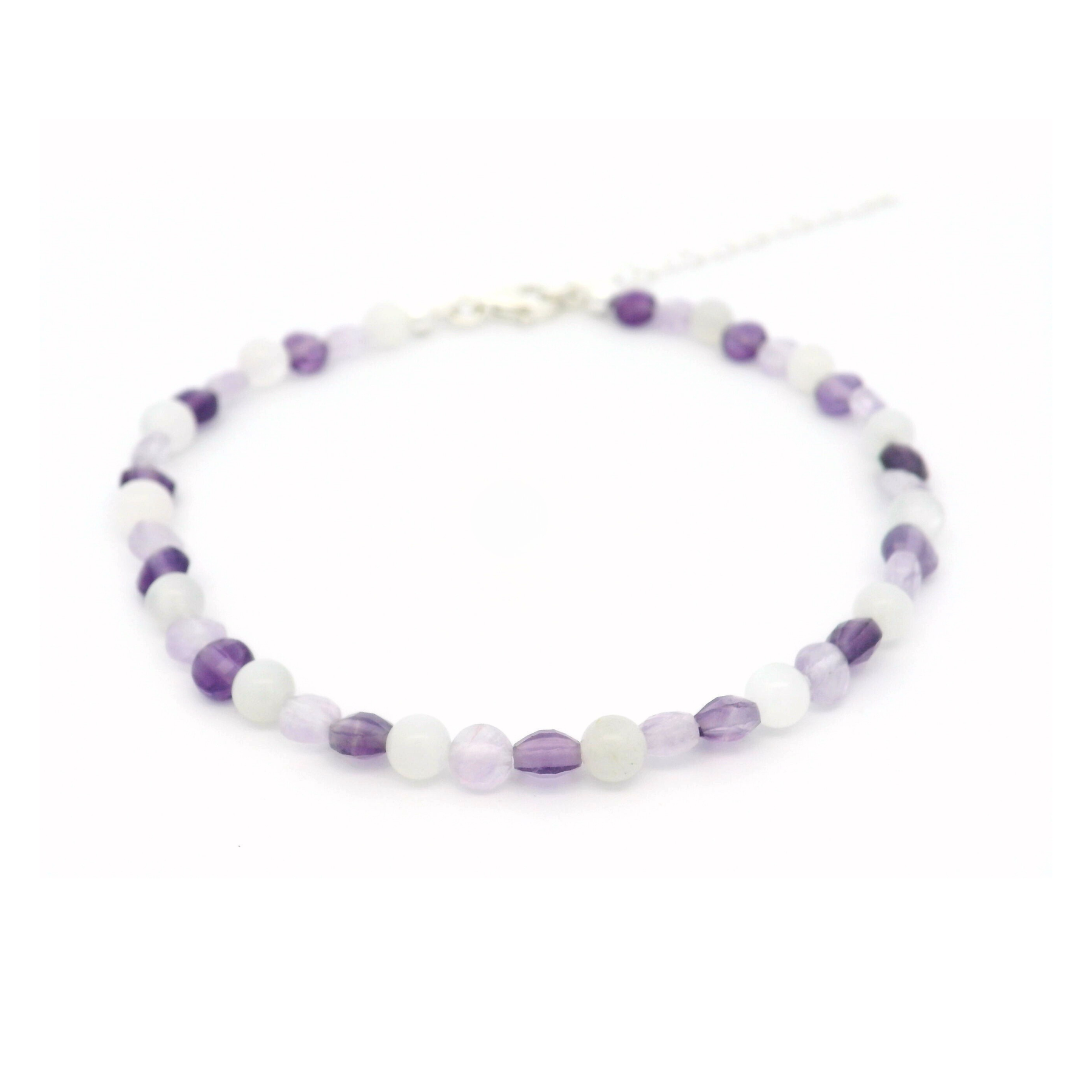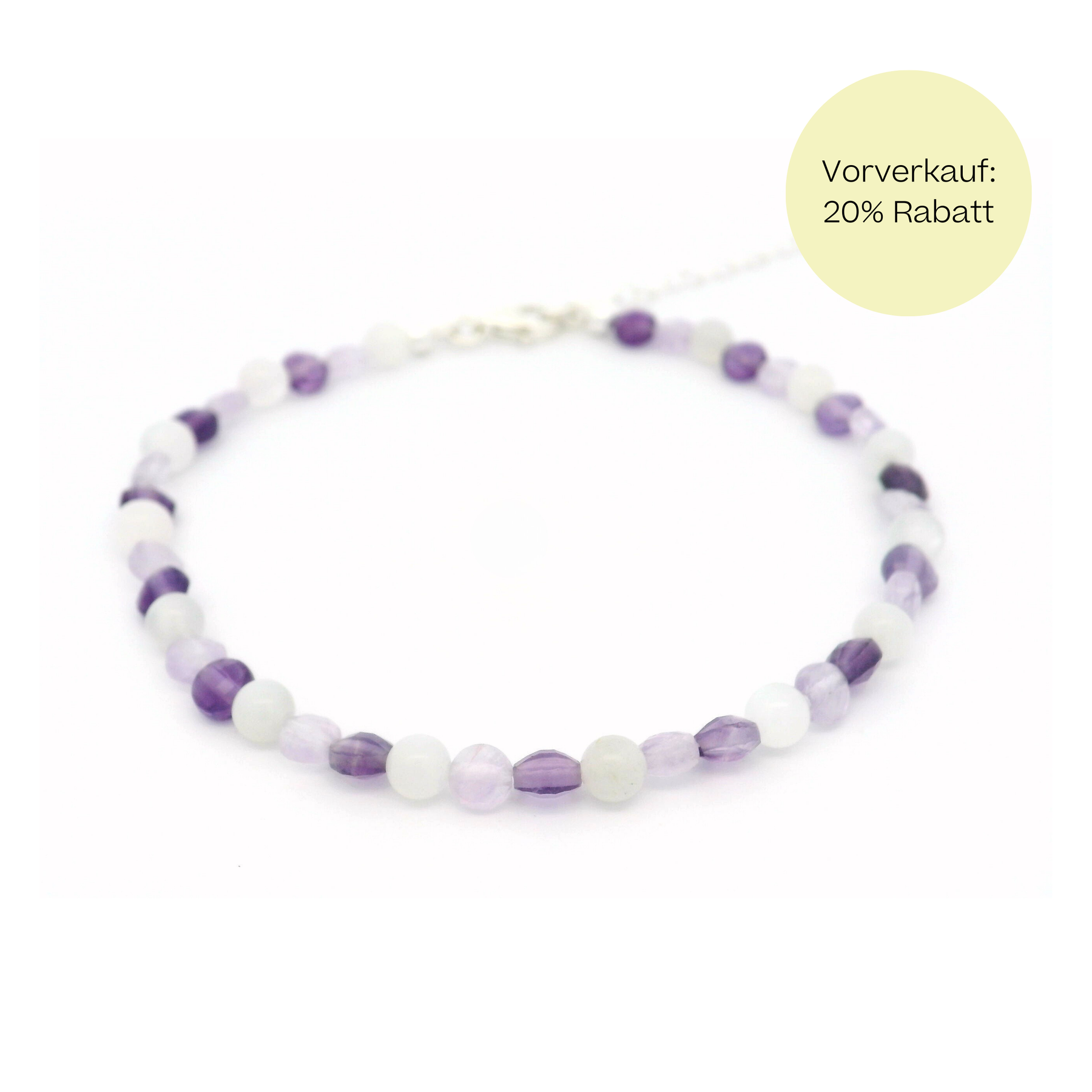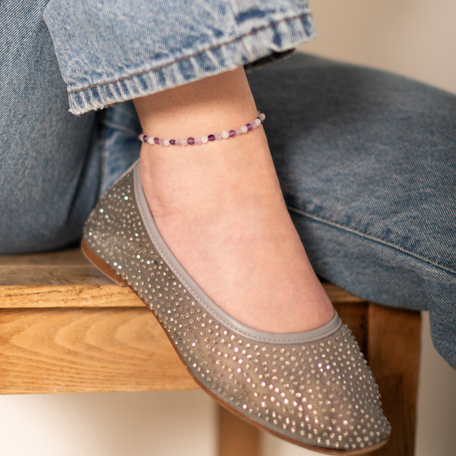 Die Fusskette Violet Meadow erinnert an eine blühende Frühlingswiese in sanften Lila Tönen. Die Amethyst Steine sollen eine beruhigende Wirkung haben und die Fantasie beflügeln.